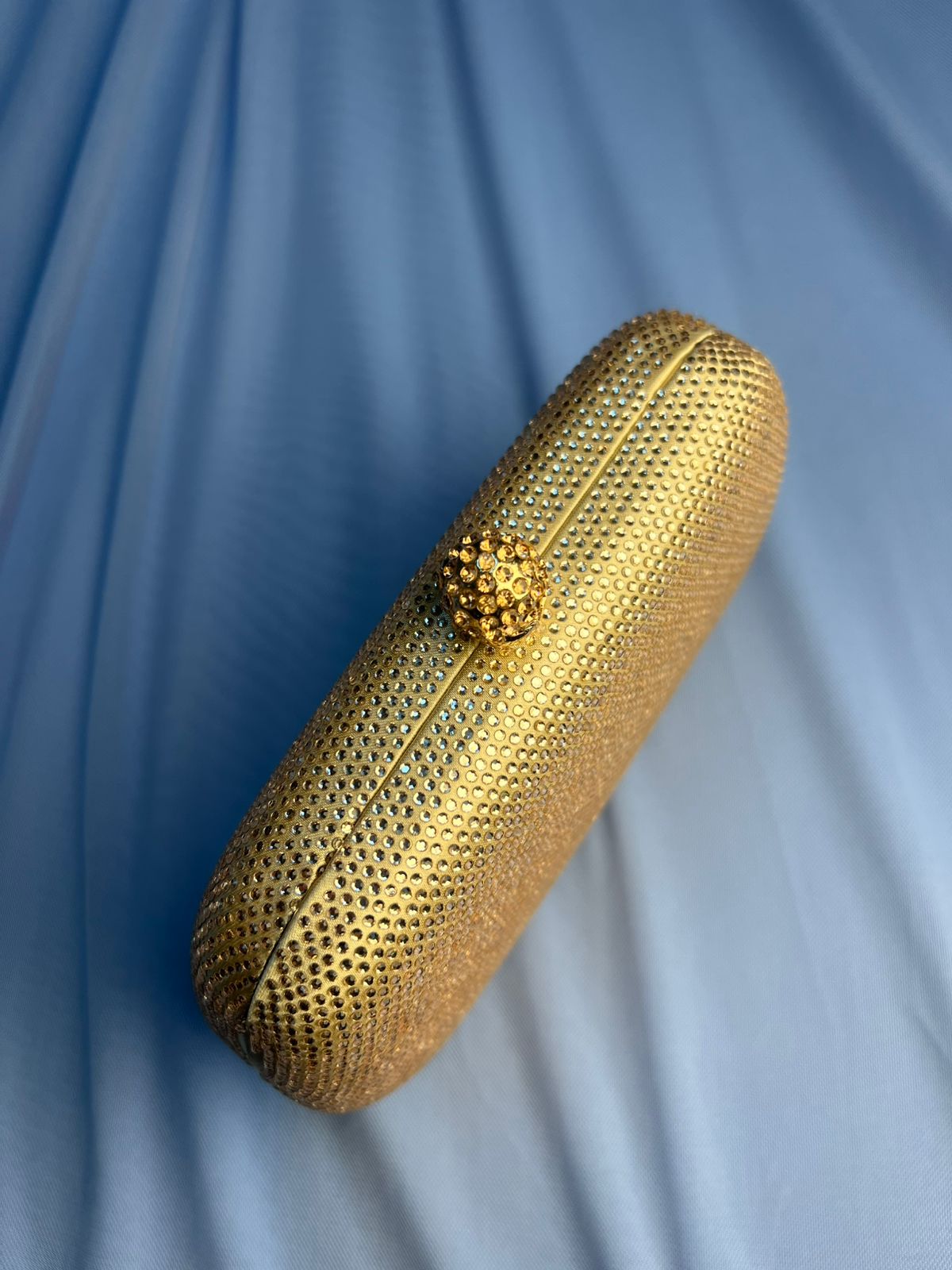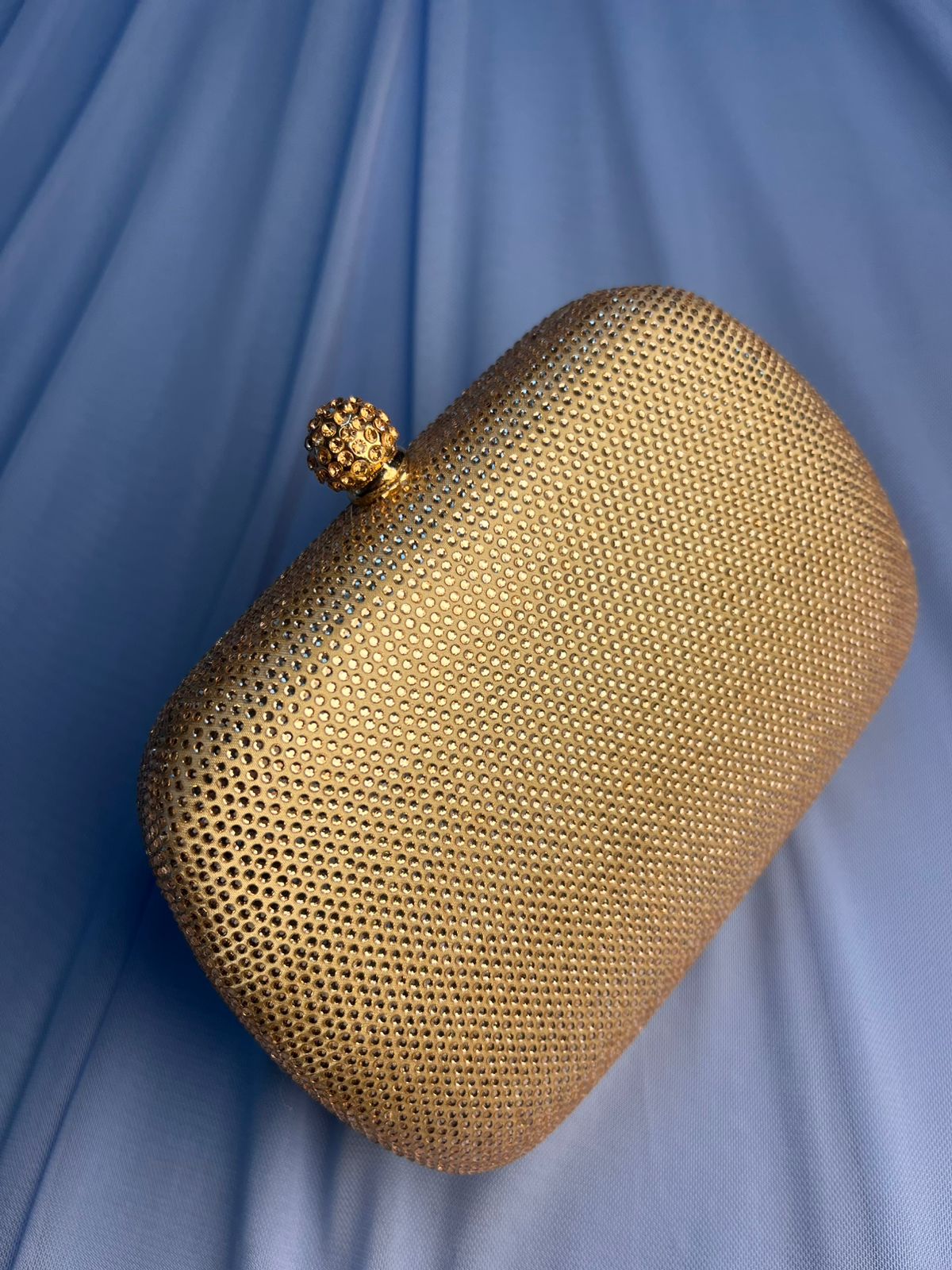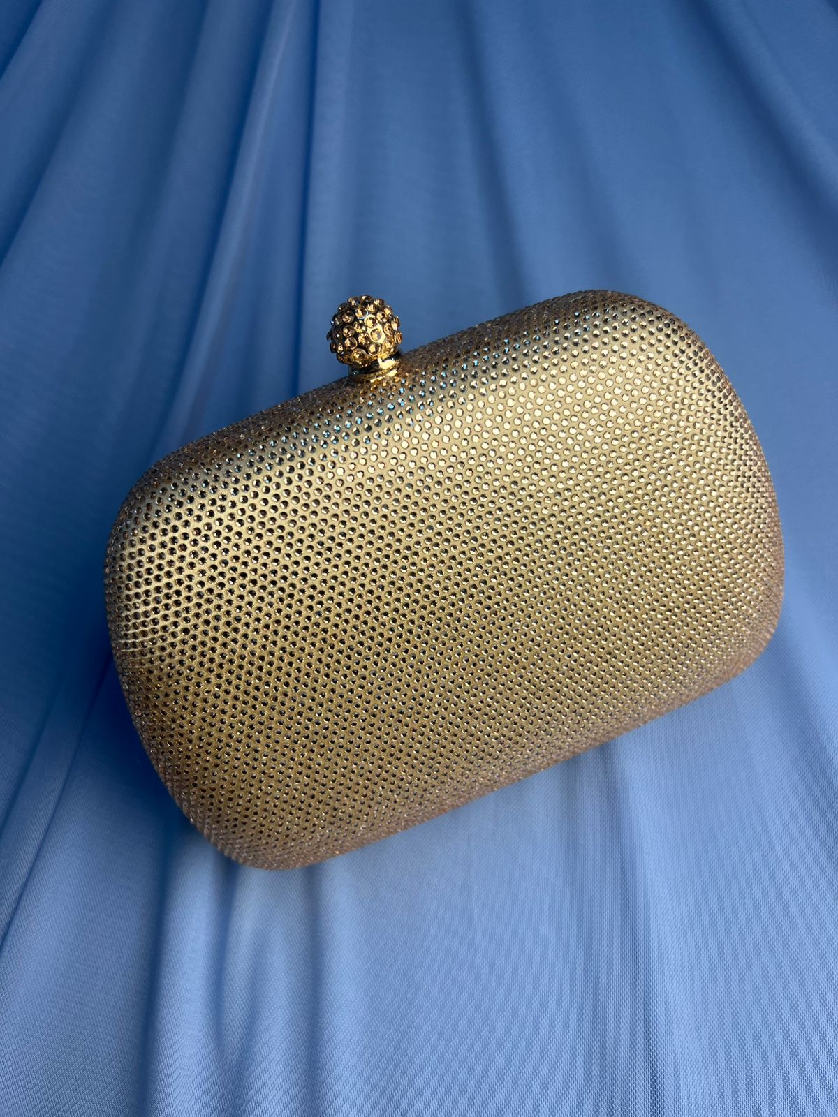 A clutch dourada com pedrarias luxe gold é um acessório de impacto, perfeito para eventos especiais. Combina com tons neutros, metálicos ou até cores vibrantes, elevando qualquer look. Sofisticada e funcional, é ideal para complementar produções elegantes.