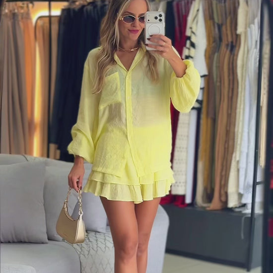 A camisa possui modelagem soltinha, mangas amplas e fechamento frontal, garantindo um visual elegante e descontraído. O shorts com babados e cintura confortável traz movimento e feminilidade ao look. Ideal para composições versáteis, do passeio ao visual de verão mais chic, podendo ser usado junto ou separado.