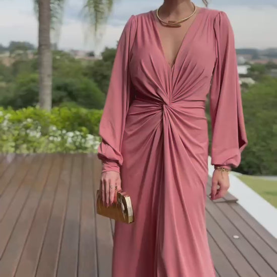 Vestido de elegância escultural, com drapeados delicados que valorizam tanto a frente quanto as costas. O decote profundo em V acrescenta uma dose de sensualidade refinada, enquanto o caimento impecável traduz sofisticação, leveza e charme atemporal.