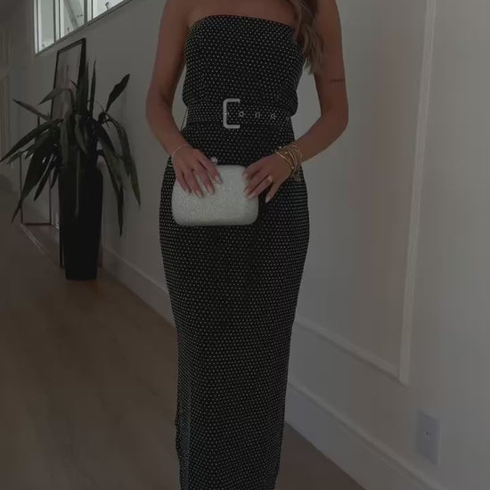Vestido tomara que caia preto com strass, uma peça que une elegância atemporal e brilho discreto. O design realça a silhueta, enquanto os detalhes em strass conferem um toque de sofisticação e luxo, tornando-o ideal para eventos exclusivos e ocasiões especiais.