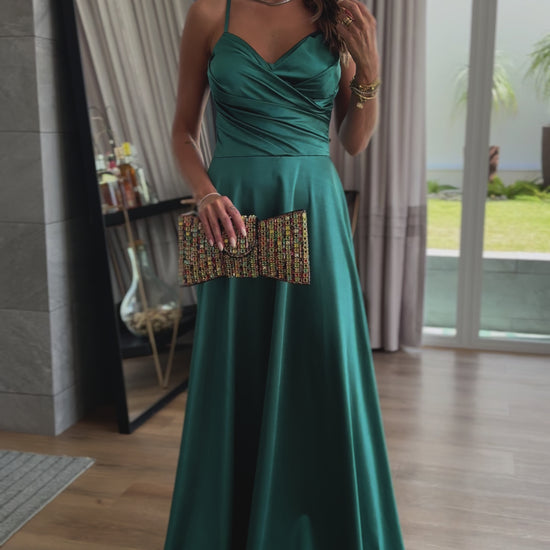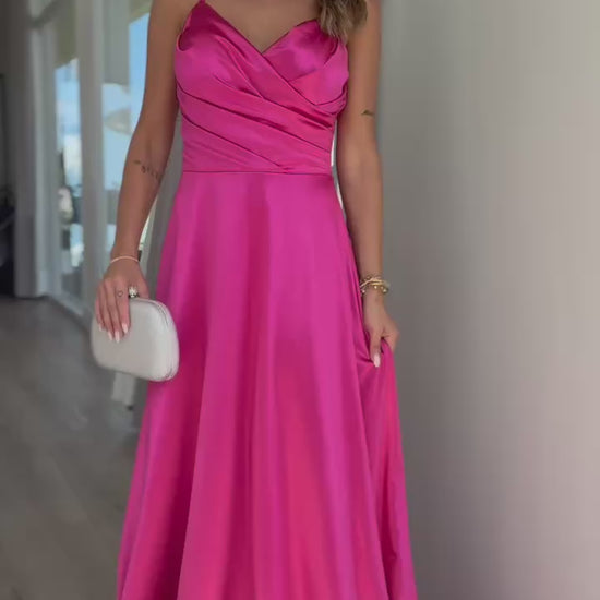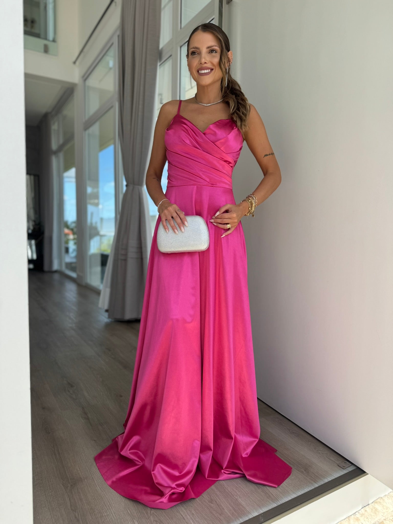 Delicadeza e sofisticação em um vestido acetinado de toque luxuoso.