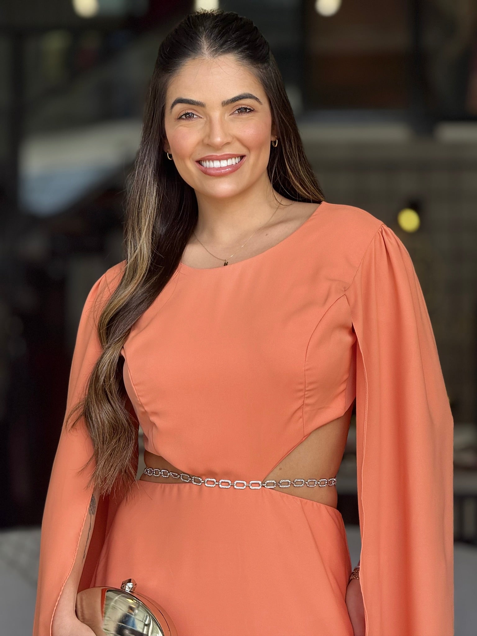 Este vestido Blair combina elegância e modernidade com suas mangas falsas longas que valorizam o visual sem abrir a mão do conforto. A abertura na cintura realça a silhueta de forma sutil e sofisticada, enquanto o cinto com brilho adiciona um toque de glamour, perfeito para benefícios especiais. Uma peça harmoniosa que destaca sua presença com delicadeza e estilo refinado.