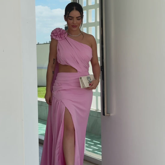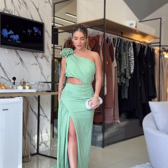Este vestido longo é puro impacto. O recorte lateral, a fenda frontal e a capa fluída criam um visual elegante, moderno e levemente ousado. O detalhe da flor no ombro é delicada e feita à mão, acrescenta um toque romântico e cheio de charme. Confeccionado em material de alta qualidade, ele une beleza, conforto e sofisticação. Uma peça única para brilhar em qualquer ocasião especial.