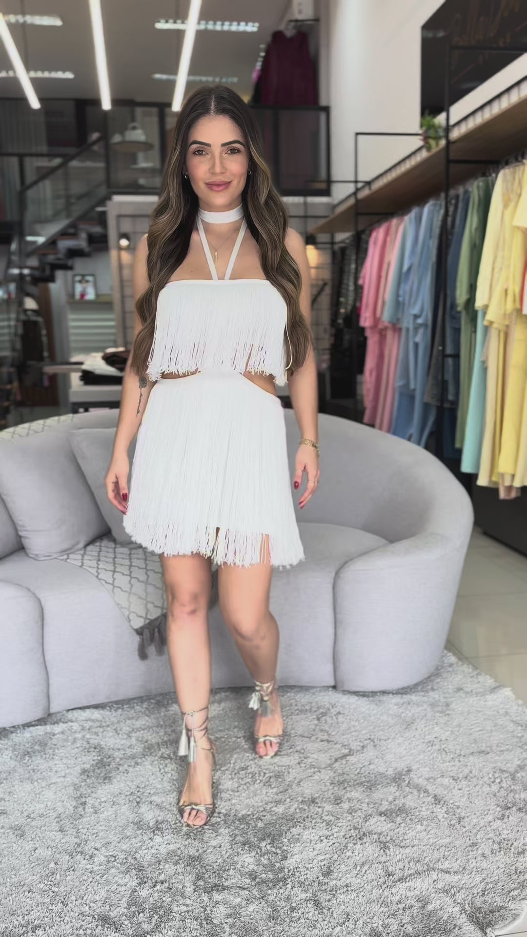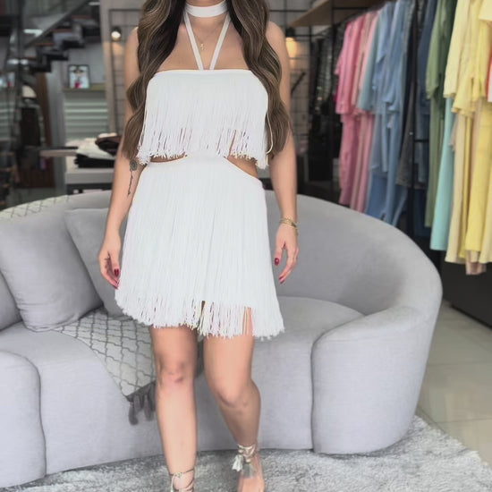 Vestido curto cheio de estilo e personalidade, ideal para quem busca um look moderno e impactante. Confeccionado com franjas delicadas, ele traz movimento e leveza a cada passo. O modelo conta com recortes estratégicos na cintura, valorizando a silhueta, além de detalhe choker integrado que adiciona um toque fashion e sofisticado. Perfeito para festas, eventos especiais ou produções noturnas onde o destaque é indispensável.