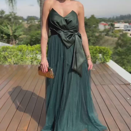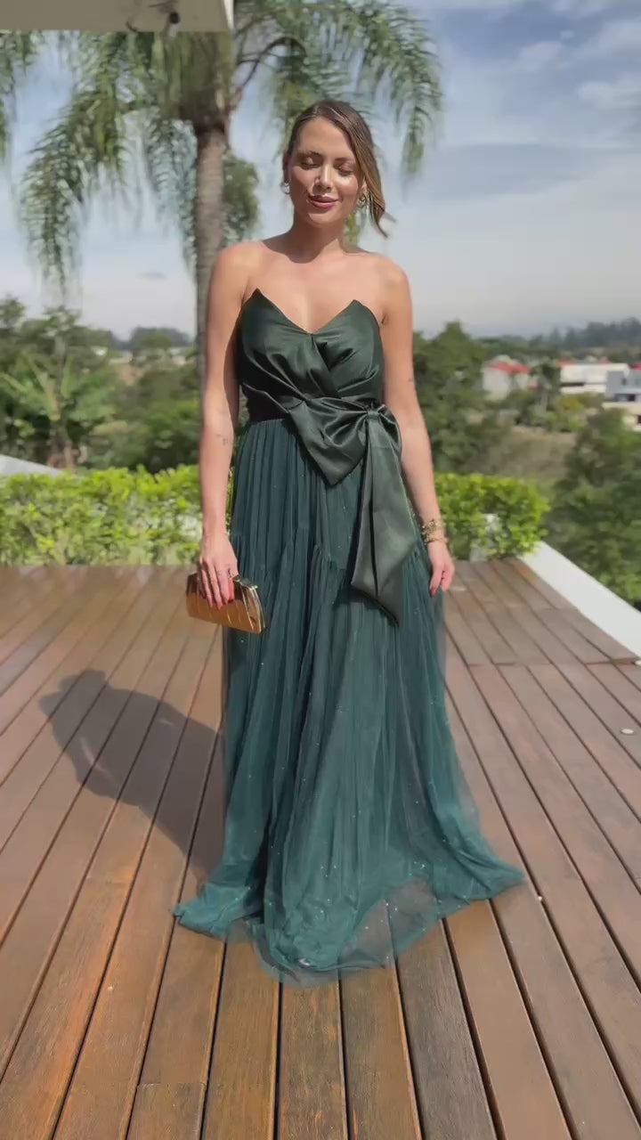 "Vestido de silhueta impecável, com busto estruturado em corset e laço delicado que acentua a cintura. A saia volumosa em tule evoca uma aura etérea e romântica, combinando feminilidade exuberante com sofisticação atemporal. Uma peça deslumbrante que traduz graça e requinte em cada detalhe."