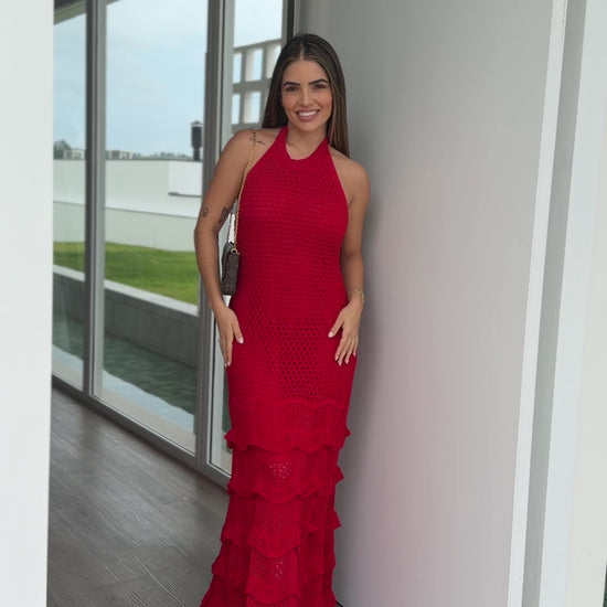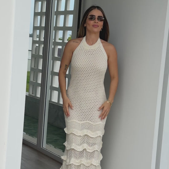 Vestido longo em crochê com modelagem frente única que valoriza o colo. Possui caimento ajustado ao corpo e babados em camadas na barra, trazendo movimento e elegância. Perfeito para ocasiões especiais e produções de verão chic.