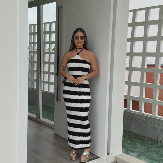 Vestido longo em tricot com padronagem listrada, que combina elegância atemporal e estilo moderno. O modelo frente única valoriza o colo e os ombros, enquanto a modelagem ajustada acompanha a silhueta com sofisticação. Confortável e versátil, é ideal para produções resort, eventos diurnos, almoços especiais ou ocasiões que pedem um visual marcante e elegante sem esforço. Uma peça statement, perfeita para quem busca charme e personalidade em um único look.