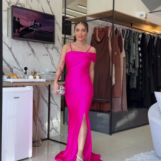 Em tom pink vibrante, ele apresenta modelagem sereia que valoriza as curvas com sofisticação. O busto possui dobras estruturadas e um detalhe assimétrico no ombro, trazendo modernidade e charme ao look. A fenda frontal garante movimento e um toque extra de sensualidade na medida certa.