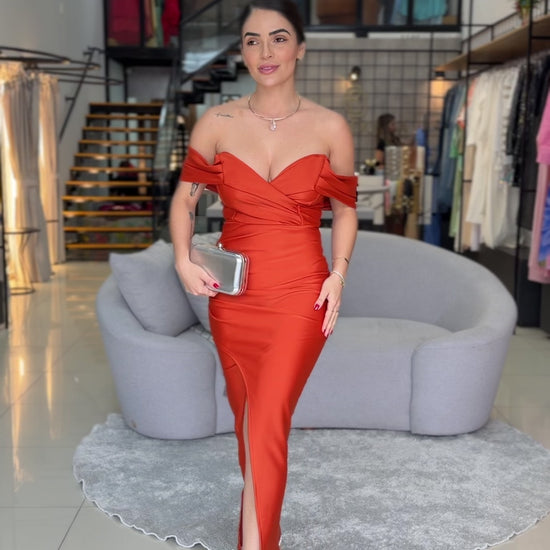 Vestido midi de modelagem sofisticada, perfeito para ocasiões especiais. O decote ombro a ombro valoriza o colo com elegância, enquanto o drapeado no busto cria um visual refinado e feminino. A silhueta ajustada realça as curvas e a fenda frontal adiciona sensualidade na medida certa, garantindo movimento e charme ao look. Uma peça marcante, ideal para festas, eventos noturnos e produções elegantes que pedem presença e estilo.