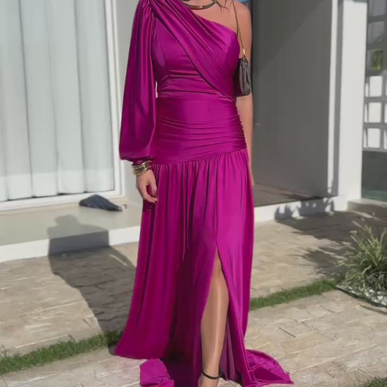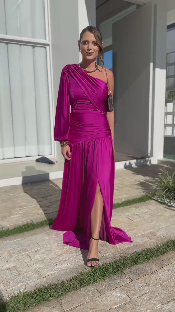 Vestido deslumbrante de um ombro só, com drapeado elegante, fenda frontal e caimento impecável que valoriza a silhueta. Sofisticado e moderno, está disponível nas cores vinho, fúcsia e azul marinho — tons marcantes que reforçam o glamour da peça.