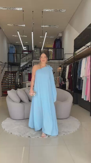 Vestido fluido verde, de caimento impecável, com delicada aplicação floral no ombro. Uma peça que une leveza e requinte, perfeita para quem busca uma elegância natural e atemporal