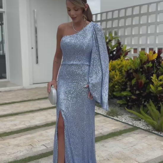 O brilho profundo dos paetês azuis, combinado ao design de ombro único, cria uma peça que exala sofisticação e modernidade. Um vestido que reflete glamour e requinte, perfeito para ocasiões que exigem presença e distinção.