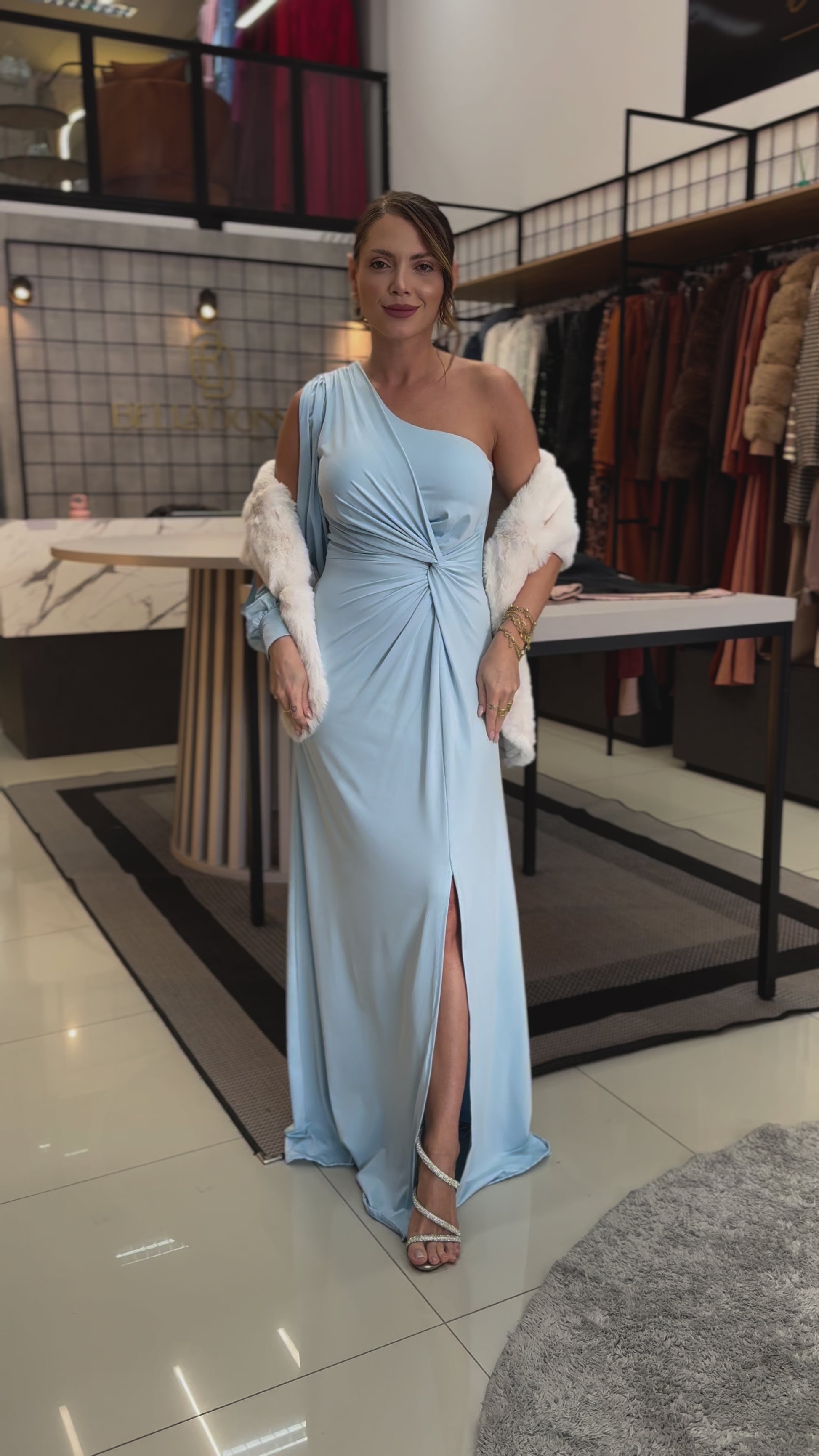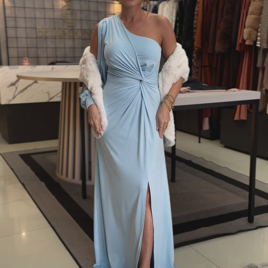 Elegância escultural em vestido de um ombro só, adornado por uma manga flare de movimento etéreo. A silhueta assimétrica, somada ao caimento fluido, traduz modernidade, sofisticação e um charme absolutamente atemporal.